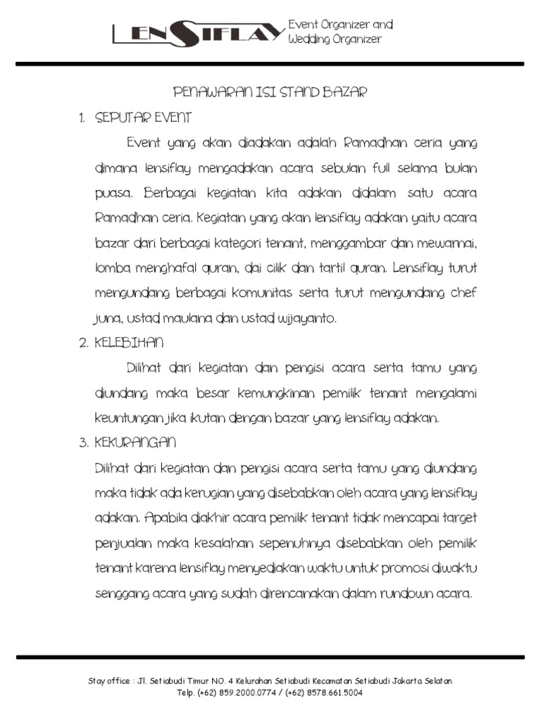 Perubahan dunia yang tidak terbendung lagi menyebabkan segala bidang kehidupan mengalami kemajuan pesat, salah satunya adalah bidang sastra dan bahasa. Contoh proposal event organizer koleksi undangan, desain undangan contoh, undangan, unik. Festivalindonesia.wordpress.com informasi pameran, event, dan bazaar indonesia. Contoh lengkap proposal event organizer konser. Contoh proposal event bazaar also relates to: